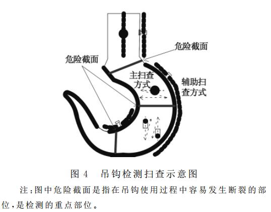 為防止缺陷漏檢,按圖4進(jìn)行掃查直探頭采用接觸式在鉤柄圓柱、鉤腔、鉤腔外圓弧和鉤頭一側(cè)表面垂直于鍛造流線方向做鋸齒形掃查。掃描線按聲程1:1調(diào)節(jié),以2平底孔為掃 查靈敏度,3平底孔為評(píng)定線靈敏度,耦合補(bǔ)償用試塊和工件實(shí)際測(cè)定。斜探頭在鉤頭兩側(cè)面沿鍛造流線方向做平行掃查和斜探頭在鉤腔內(nèi)表面垂直于鍛造易折疊部位做鋸齒型掃查,掃描線速度按聲程1:1調(diào)節(jié),靈敏度按2.4.3調(diào)節(jié),耦合補(bǔ)償用試塊和工件實(shí)際測(cè)定。確因鍛件幾何形狀的限制而掃查不到的部位,應(yīng)予以記錄和圖示,必要時(shí)還應(yīng)得到各方同意。
