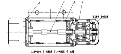 CD1型電動(dòng)葫蘆起升機(jī)構(gòu)采用錐形轉(zhuǎn)子電動(dòng)機(jī),它具有產(chǎn)生軸向磁拉力的特點(diǎn)。起動(dòng)時(shí),磁拉力克服彈簧壓力使轉(zhuǎn)子和與定子連成一體的風(fēng)扇制動(dòng)輪產(chǎn)生軸向位移,制動(dòng)輪剎車環(huán)與后端差脫開(kāi),轉(zhuǎn)子即在工作狀態(tài)下自由運(yùn)轉(zhuǎn),它通過(guò)中間軸裝置直接帶動(dòng)減速器的輸入軸轉(zhuǎn)動(dòng),經(jīng)過(guò)三級(jí)齒輪減速,由減速器的輸郵軸——空心軸驅(qū)動(dòng)卷筒轉(zhuǎn)動(dòng),纏繞鋼絲繩,使吊鉤升降。當(dāng)斷電后,磁拉力消失,在壓力彈簧的作用下,風(fēng)扇制動(dòng)輪與后端差剎緊,依靠剎車的磨擦力在瞬間獲得制動(dòng)作用,電動(dòng)葫蘆起升機(jī)構(gòu)不工作。