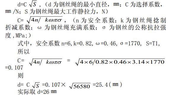 所以,與撬塊設(shè)備相匹配的是直徑為 26 ㎜,規(guī)格為6×7+IWR,強度級別為 1770Mpa 的鋼絲繩。