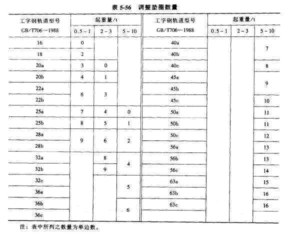 3、由于廠房跨度大小不一,選用工字梁軌道大小不同,因此走輪組件在安裝時(shí)應(yīng)隨工字梁軌道的寬度,用調(diào)整墊圈進(jìn)行調(diào)整(見圖5.48),調(diào)整墊圈數(shù)量如表5.56所示。