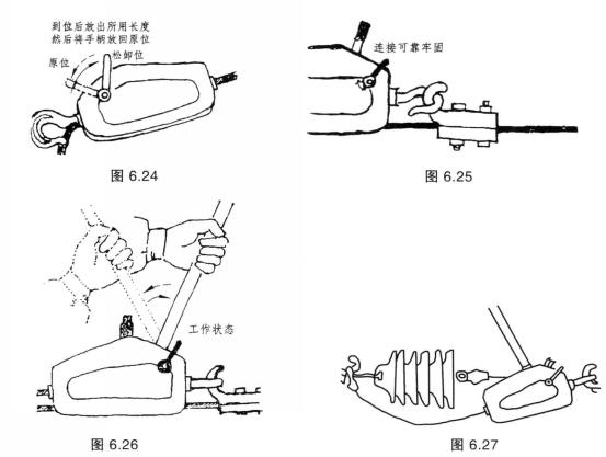 5、松卸張力時(shí),將手柄(葫蘆把)套住方向桿上往復(fù)擺動(dòng),即可松卸牽引繩。待部件受力鏈接牢固后,方可撤除手扳葫蘆,如圖6.27所示。