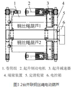 采用4/2倍率繞繩方式,由于第一層鋼絲繩與第二層鋼絲繩在卷筒上有高低差(即鋼絲繩直徑差),卷筒轉(zhuǎn)動時(shí),上下兩層鋼絲繩進(jìn)出繩速度會不一致,因此,通過增加一個(gè)平衡滑輪,調(diào)整繩速,使起吊平穩(wěn),解決了以往2臺電動葫蘆并聯(lián)時(shí)容易出現(xiàn)的出繩和入繩不同步的現(xiàn)象,提高了鋼絲繩電動葫蘆的使用壽命。