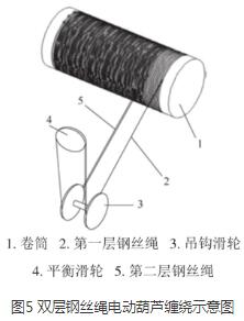 雙層鋼絲繩纏繞系統(tǒng)主要由卷筒、第一層鋼絲繩、第二層鋼絲繩、第一層鋼絲繩導(dǎo)繩器、第二層鋼絲繩導(dǎo)繩器、平衡滑輪、吊鉤滑輪等組成。如圖5、圖6所示。