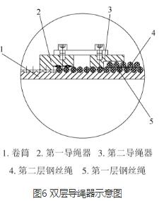 采用單根鋼絲繩雙層同向纏繞的方式:鋼絲繩兩端分別固定于卷筒的同一端部,鋼絲繩的一端在卷筒上卷繞形成第一層鋼絲繩,鋼絲繩的另一端在卷筒與第一層鋼絲繩上卷繞形成第二層鋼絲繩。同時(shí)卷筒上安裝有防止第一層鋼絲繩亂繩的第一導(dǎo)繩器,第一層鋼絲繩上安裝有防止第二層鋼絲繩亂繩的第二導(dǎo)繩器,2個(gè)導(dǎo)繩器之間向固定連接,如圖6所示。運(yùn)行時(shí),第一導(dǎo)繩器與第二導(dǎo)繩器同時(shí)工作,向相同方向移動,從而實(shí)現(xiàn)兩層鋼絲繩能同時(shí)卷繞或釋放,進(jìn)而實(shí)現(xiàn)在電動葫蘆體積不變的情況下,起升高度幾乎是原電動葫蘆的2倍,大大提高了電動葫蘆的起升高度。
