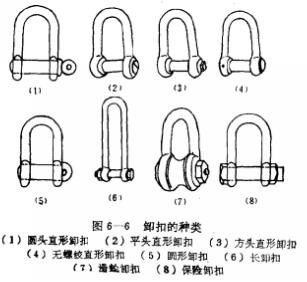 1、圓頭卸扣:這種卸扣的銷的端部,有一種圓形的銷柄(圖6-6),不用器械科徒手加一扣合合卸脫,使用較為方便,故在漁具上普遍使用。如漁船船尾的拽引裝置與拽崗的連接,水上部分構件件的連接均用此類卸扣。但該卸扣不宜用于拽綱間的連接,以免在放絞拽綱時,突出的銷柄與其他屬具發(fā)生掛鉤。圓頭卸扣的銷柄環(huán)眼處,可貫穿保險鉛絲與卸扣本體縛住,以防止栓的脫落。為防止生銹和便于卸脫,在其螺紋部分需涂以牛油。