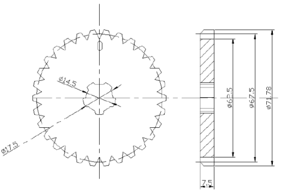 根據(jù)葫蘆傳動齒輪低速重載,根據(jù)手拉葫蘆傳動結(jié)構(gòu)的原理由五尺長軸的小齒輪帶動片齒輪甲、乙,考慮到五尺長軸的小齒輪齒數(shù)甚小等特點,1.5型葫蘆選用了齒形角20°的漸開線特種片齒輪變位齒輪,其基本齒形的基本參數(shù)如圖所示。選用齒形是考慮了以下因素:1.5t葫蘆傳動齒輪的小齒輪齒數(shù)甚少為了避免根切和增強度,只能用正變位切削這樣小齒輪的外圓就受齒條的正切力,片齒輪與短軸屬于過硬配合,片齒輪的中心要設計出與短軸尺寸屬于硬配合的小花鍵孔尺寸如圖所示: