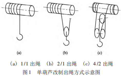 單葫蘆改制適用于 1 /1、2 /1 和4 /2 等出繩方式。單葫蘆改制方案適合于1 ~ 5 t 小起重量的電動(dòng)葫蘆。該種改制方法相對(duì)比較簡(jiǎn)單,主要是利用較大噸位的葫蘆進(jìn)行倍率變換使用。圖 1 為 3 種出繩方式的示意圖。