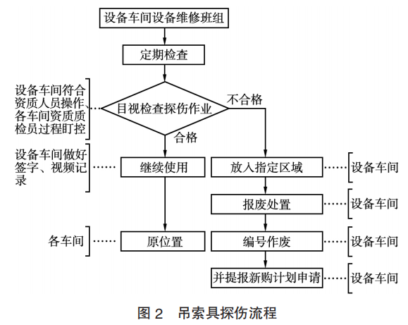 由設(shè)備車間定期進(jìn)行檢查檢測,經(jīng)過探傷后合格的吊索具交由原車間繼續(xù)使用,并做好相關(guān)視頻和紙質(zhì)記錄;對檢測不合格的,要放入指定區(qū)域,集中報廢處置并做好記錄,同時啟動新購流程。