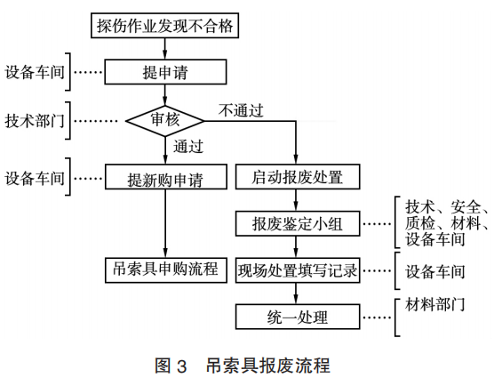 當(dāng)探傷發(fā)現(xiàn)有不合格吊索具時(shí),由設(shè)備車(chē)間提報(bào)報(bào)廢申請(qǐng),報(bào)技術(shù)部門(mén)審核,通過(guò)后設(shè)備車(chē)間組織報(bào)廢鑒定小組進(jìn)行現(xiàn)場(chǎng)處置并填寫(xiě)臺(tái)賬記錄,同時(shí)由材料部門(mén)處置并新購(gòu)。