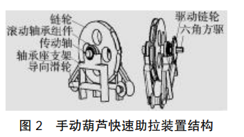 手拉葫蘆快速助拉裝置可以固定手拉葫蘆的手拉鏈條,給手拉鏈條提供拉力以提升重物,驅(qū)動力可通過鏈輪外接電機(jī),也 可以通過內(nèi)六角接頭外接氣動扳手。 該裝置由鏈輪、滾動軸承組件、傳動軸、軸承座支架、導(dǎo)向滑輪、驅(qū)動鏈輪和外六角方驅(qū)組成(圖 2)。