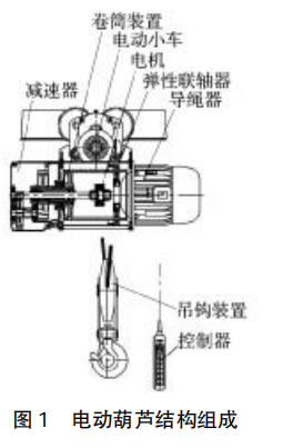 鋼絲繩電動葫蘆又可以分為單速提升型、雙速提升型、微型電動葫蘆、卷揚機(jī)、多功能提升機(jī)等多種類型。化工廠常用電葫蘆為微型電動葫蘆或懸臂葫蘆,往往在加料或維修車間頻繁進(jìn)行檢維修作業(yè)的固定點位安裝,設(shè)備拆裝位置因綜合考慮現(xiàn)場空間安全和建 造成本往往不會安裝電動葫蘆,化工廠常用電動葫蘆結(jié)構(gòu)組成如圖1所示。研究發(fā)現(xiàn),現(xiàn)階段暫未存在同 時具備所需空間小、成本低廉、便 于移動且工作高效的小型起重機(jī) 械,也尚未存在對借助外力輔助 手拉葫蘆作業(yè)裝置的設(shè)計研究。