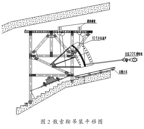 第一,利用大噸位汽車吊將散索鞍放置在隧道口的運鞍小車上,洞口反拉卷揚機預(yù)緊受力。使用多個5t手拉葫蘆使鞍體與運鞍小車固定,并在運鞍小車上焊接限位進一步固定鞍體。