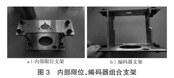 為了滿足在緊湊的環(huán)鏈葫蘆殼體內(nèi)部加裝機(jī)械限位開關(guān)、編碼器的需求,需要根據(jù) ABUS 環(huán)鏈葫蘆自帶原裝限位開關(guān)的外觀尺寸以及編碼器的安裝尺寸來設(shè)計(jì)加工固定支架。支架部件間采用可調(diào)節(jié)連接方式,立支架兩側(cè)開挖空檔,便于人工手動(dòng)調(diào)整限位開關(guān)。內(nèi)部限位、編碼器組合支架如圖 3 所示。