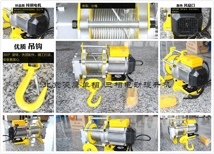 警告:?jiǎn)蜗嗵嵘龣C(jī)采用了專用電機(jī),不允許反轉(zhuǎn)提升重物,嚴(yán)禁改變鋼絲繩在卷桶上的纏繞方向,否則會(huì)燒壞電機(jī)。